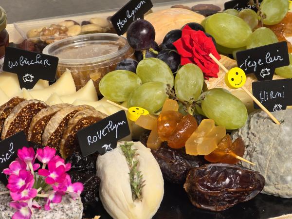 Exclusieve kazen afgewerkt met druiven, gedroogde vruchten, exclusief gekonfijt fruit, studentenhaver, confituur, siroop, gembersnippers.